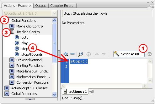 Return to the the Actions window and add a gotoAndStop(1); action to frame 4: