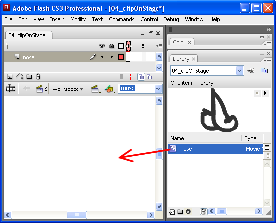Ok, let's get that nose on the stage. The keyboard shortcut to snap to the main stage is CTRL+E. Start by naming the layer nose, then drag the nose movieClip from the Library onto the stage: