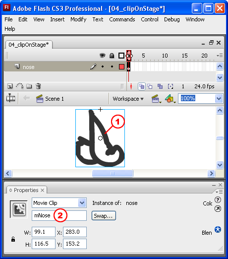 Let's assign the instance name mNose to the copy of the nose MovieClip you have on the stage: