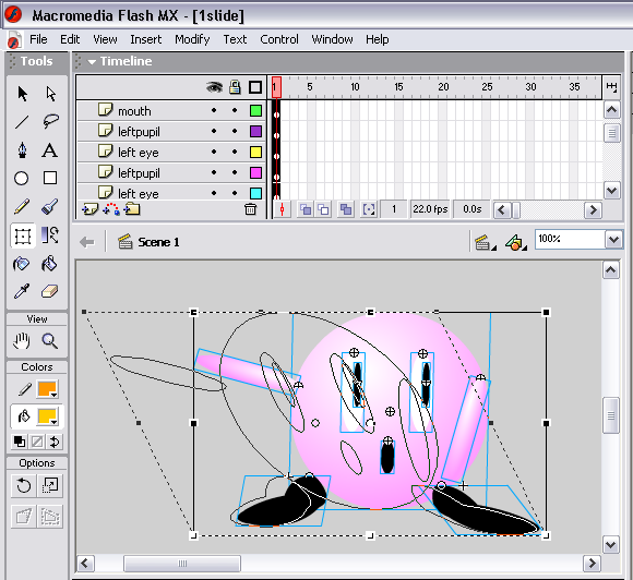 Start with the same character from the last project. Select everything (arms, eyes, mouth.... everything) and drag to the left, off the main stage. Next, choose the Free Transform Tool, and skew the character to the left: