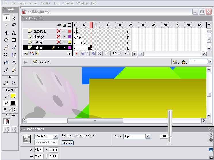 Improve on the effect by fading the Alpha a little bit on the three trailing Sliding_Character MovieClips.