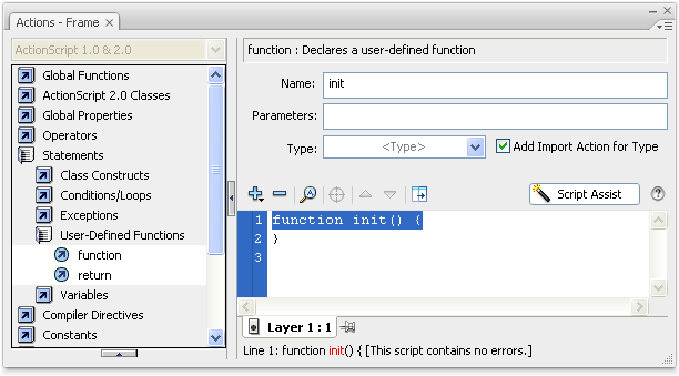 Now let's create a function that runs when the movie first loads. It's very common to call this function init (short for initialize) although this is a made up name. So, rename Layer 1 Actions, select the first frame, and bring up the ActionScript dialogue box: