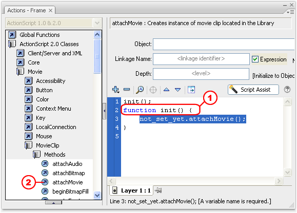- Click ActionScript 2.0 Classes > Movie > MovieClip > Methods and Double-Click attachMovie