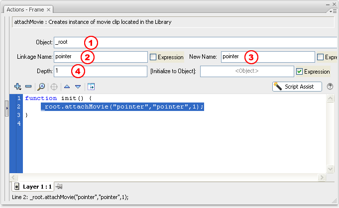 Fourth: The Depth! Every MovieClip placed on the stage with ActionScript has to have it's own depth. It's rather like the stacking order of layers in the timeline. Since this is the only clip we are using right now, we are starting with a Depth of 1. If we were to place another object on the stage with a depth of 1, our "pointer" would completely disappear. Remember that!