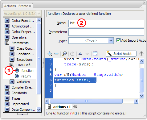 Now add the attachMovie action to that init function. Remember, this action goes {inside the function braces}: