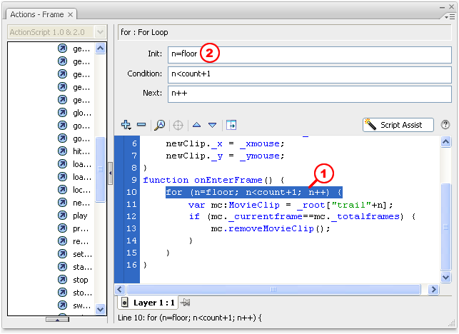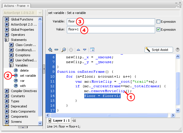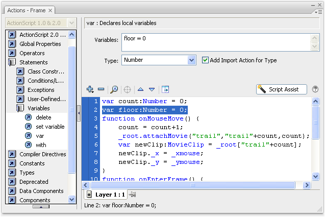 Of course, we're going to have to declare that floor variable at the start of the script. Remember, if you try to add 1 to a number that doesn't exist yet, Flash will return NaN (Not a Number):