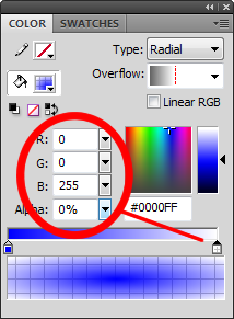 Use the Color window to setup a Radial gradient. You want a nice fade to transparent on the outside of the gradient, so choose the same colors for both the inside and outside. Really, do not choose "white" for the outside color! Pay particular attention to the RGB and Alpha settings below:
