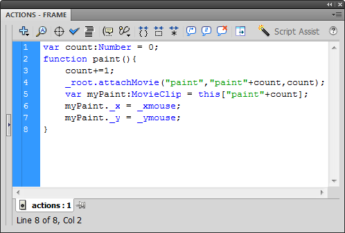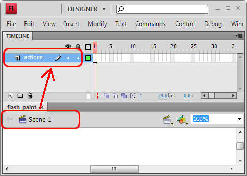 Now we'll create a function that attaches an instance of our paint MovieClip whenever it's called. First, return to Scene 1 before you do anything! It's amazingly common for novice Flash programmers to make the mistake of placing actions inside the MovieClip they're referencing. So, please return to Scene 1, and rename Layer 1 Actions: