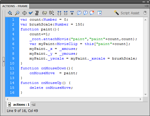 Now we'll set the _xscale and _yscale of each myPaint MovieClip equal to the variable brushScale. There's a little programming shortcut you can take, which you may not have seen yet. You may be used to completing that task with something like this: