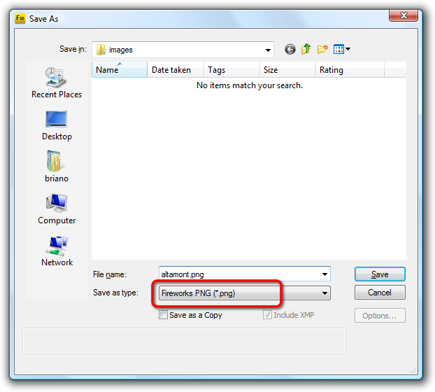 Use Save As to assign a new file name and file type. Bare-bones JPEG isn't going to cut it for this project. We need to maintain layers and transparency, so PNG (Portable Network Graphics) is our best bet. Besides, Flash loves to work with PNG bitmaps: