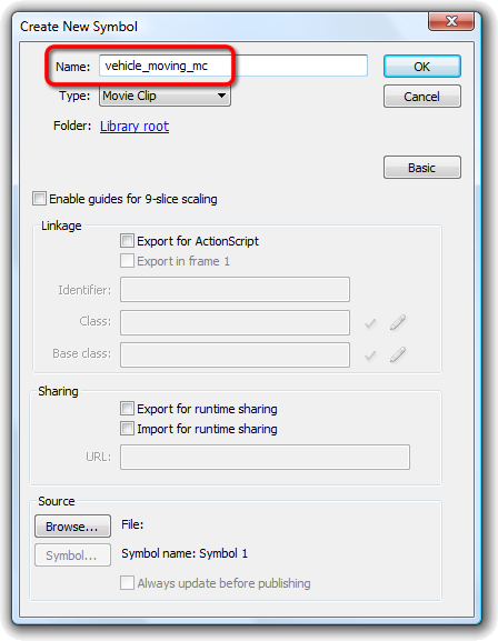 First, click Insert > New Symbol (or CTRL+F8) and create a Movie Clip named vehicle_moving_mc