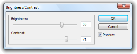Click Filters > Adjust Color > Brightness/Contrast. We're really going to have to punch up these levels. Take a look at the example window:
