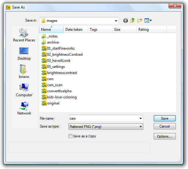 Now Save As and change the file type to Flattened PNG. By the way, your keyboard shortcut in the Adobe Suite is CTRL+SHIFT+S: