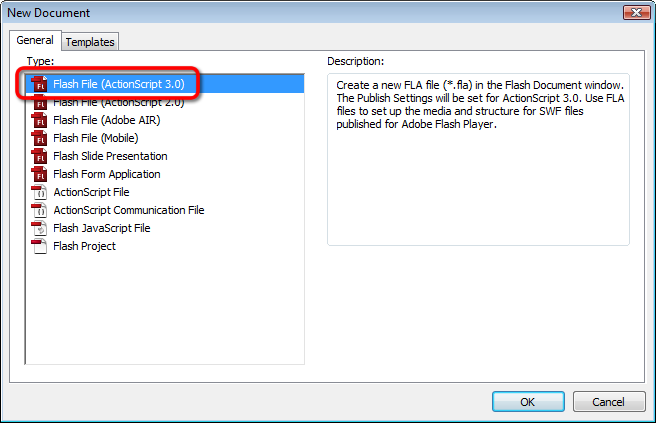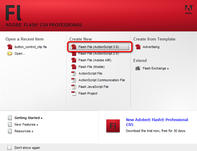 If you just started Flash, select the Flash File (ActionScript 3.0) link located under the Create New: