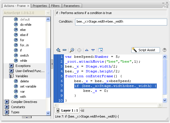 The bee's width can be checked (or set) by referencing bee._width. We can use this to check if the bee's x position is greater than the stage width plus the width of the bee! Then the entire bee will be off the stage for sure: