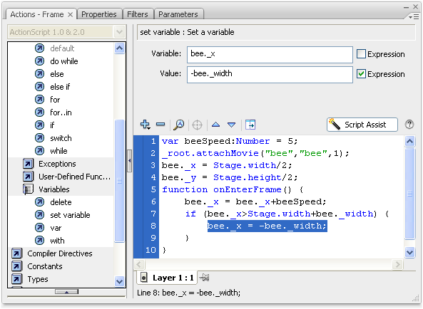 What we need is to figure out how many pixels of bee are hanging out to the left of the center point. Flash has another property for us: _width