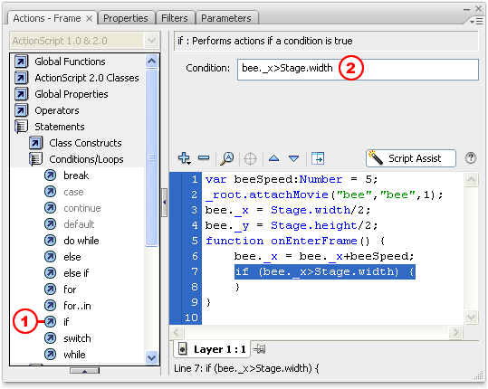 If statements are also known as condtional statements (hence the "Condition" box) because they allow you to run actions only if a condition has been met. In our example, we only want flash to do "something" if the bee's x position is greater than the width of the stage. Let's define what that something is: