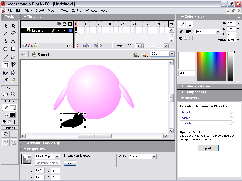 Use whatever techniques you wish to draw a left foot. Don't forget to Convert To Symbol and again set the registration point to top center. The clip should rotate around the character's ankle.