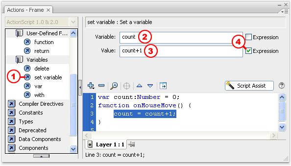 The first thing we want Flash to do is increment the count variable by 1. That's easy if we use count=count+1, which may seem just a little confusing if you've done algebra, but haven't done much programming. But it makes perfect sense to say count will be whatever count was plus one: