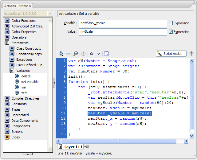 Let's start off with the code from the previous lesson, where you placed multiple copies of the same movieClip on the stage.If you can't remember how we did it, or you never did it at all, I recommend you go back and complete that lesson now. Your code should look like this: