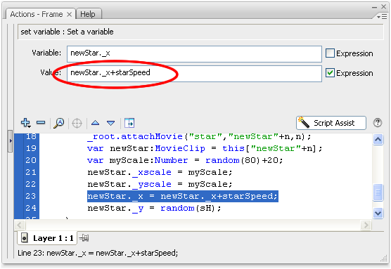 Change the Value to newStar._x+starSpeed like you see below: