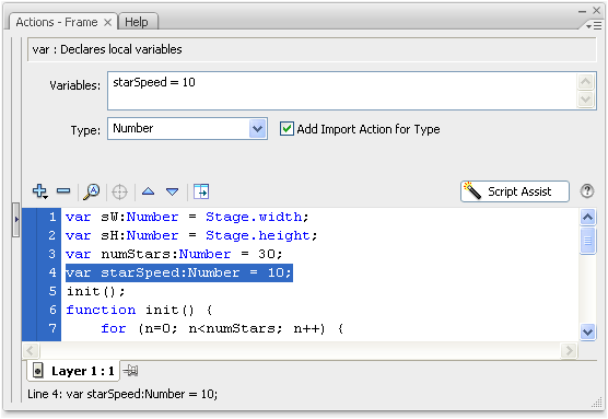 Well, if we are going to reference a variable called starSpeed, we better define it! Return to the top of the script, where we have already declared a few variables, and set starSpeed = 10 using var: