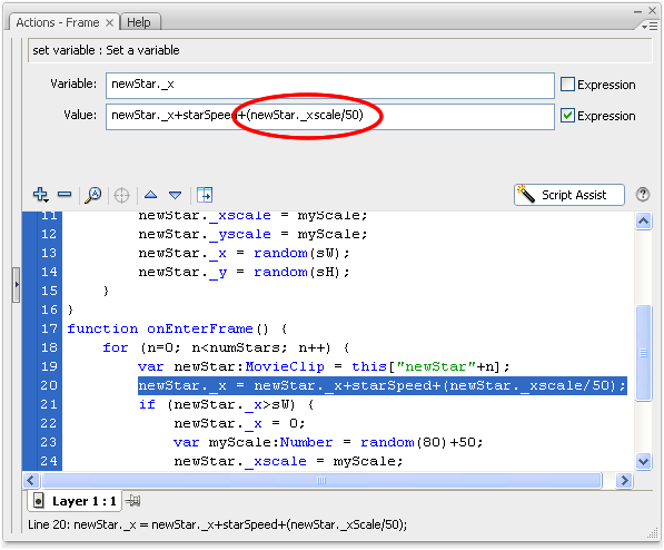 This shouldn't be too tough if you use a little bit of math! You can have flash check each star's scale using newStar._xscale (or newStar._yscale since it is the same thing). Just figure it out! I'm going to divide the scale by a number so it won't run way too fast, then add that solution to the basic starSpeed variable. My final Value is newStar._x+starSpeed+(newStar._xscale/50)