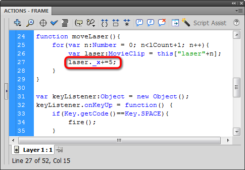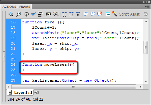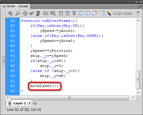 Now down in our onEnterFrame function we'll add a statement that calls moveLaser: