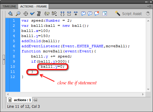 Now we tell Flash what we want it to do if the condition is true. We only want it to do one thing (ball1.y=0) and then we close the if statement with a right brace: